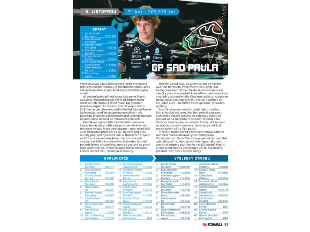 Tento 64-stranový časopis vás prevedie práve skončenou sezónou Grand Prix. Podrobne sa venuje každým z 24 pretekov, popisuje najdôležitejšie momenty, analyzuje ich a uvádza výsledky. Hlavnou témou bude, samozrejme, triumf McLarenu a úžasný výkon Maxa Verstappena. Pohľad na výnimočnú sezónu ponúknu aj rubriky ako Auto roka, Prepadák roka a Odchod roka a prekvapenie v podobe hlasovania o najlepšieho nováčika. Samozrejme, nechýbajú ani technické analýzy tohtoročných monopostov.