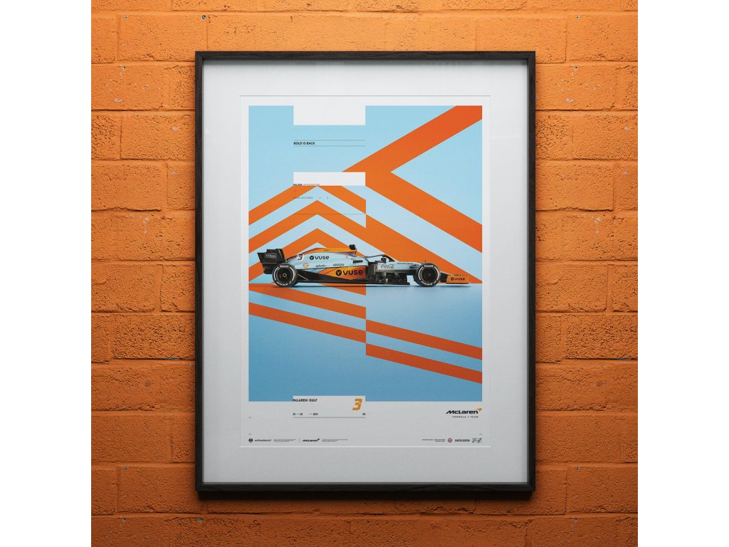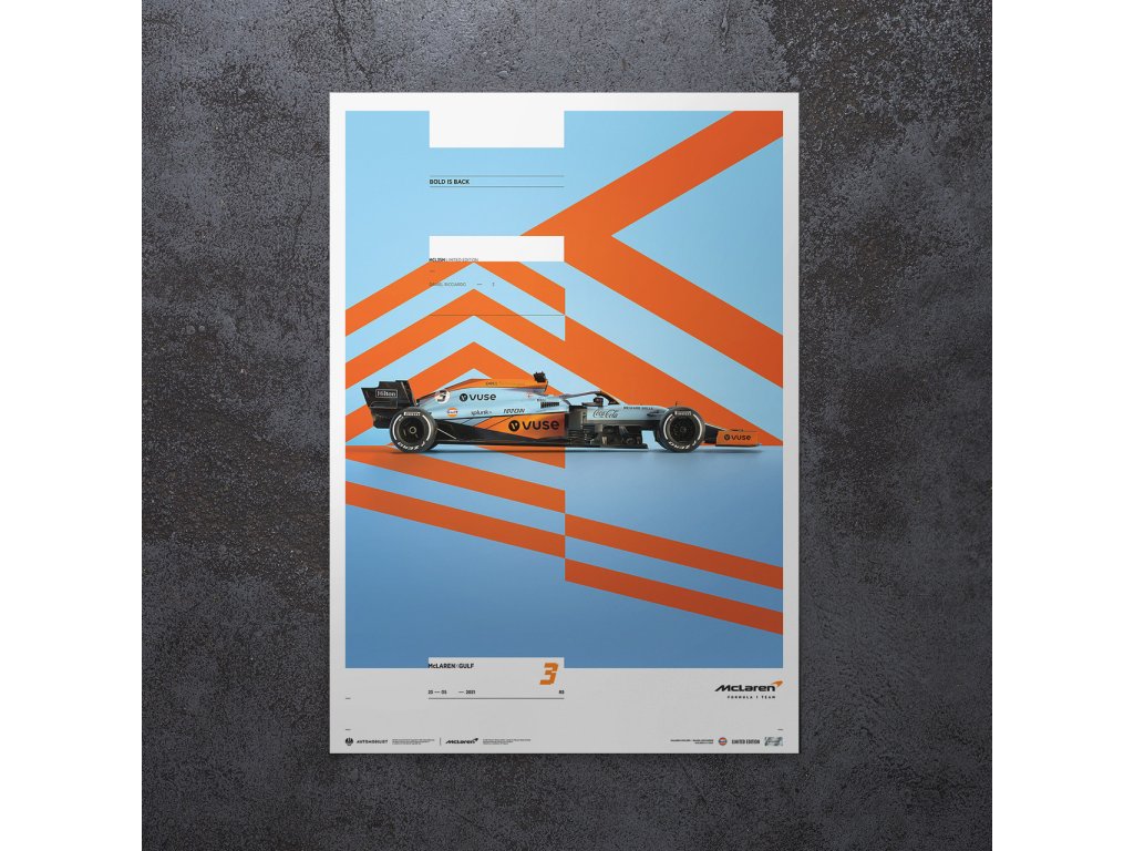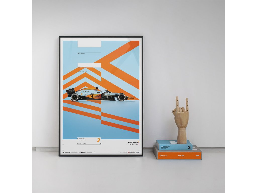 -Špeciálne navrhnuté a vytvorené na označenie špeciálneho livrejovania, ktoré vytvoril McLaren Racing na oslavu svojho partnerstva s Gulf Oil International -Zobrazuje Daniela Ricciarda s bočným pohľadom na MCL35M -Limitovaná edícia iba 2000 kusov, jedinečne očíslovaných -pri návrhu plagátu sa využíva najnovšia technológia 3D modelovania -dodáva sa ako plagát štandardnej veľkosti, 50 x 70 cm (19¾ x 27½ palca), bez rámovania -vyrobený ako vysokokvalitná ofsetová tlač na papieri s gramážou 175 g/m2 -globálna doprava z Európy, zrolovaný a dodaný v ochrannom tubuse. Prepravné sadzby. -Oficiálne licencovaný výrobok | McLaren Racing